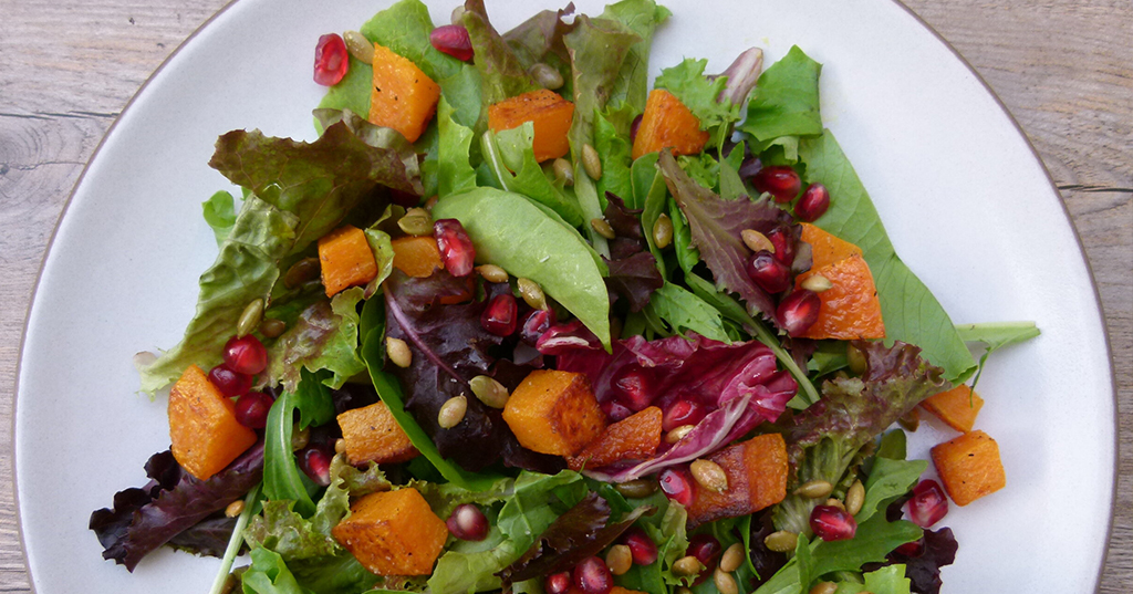 - Descasque a abóbora e corte em cubos, tempere com um pouco de azeite, sal, pimenta e misture bem.